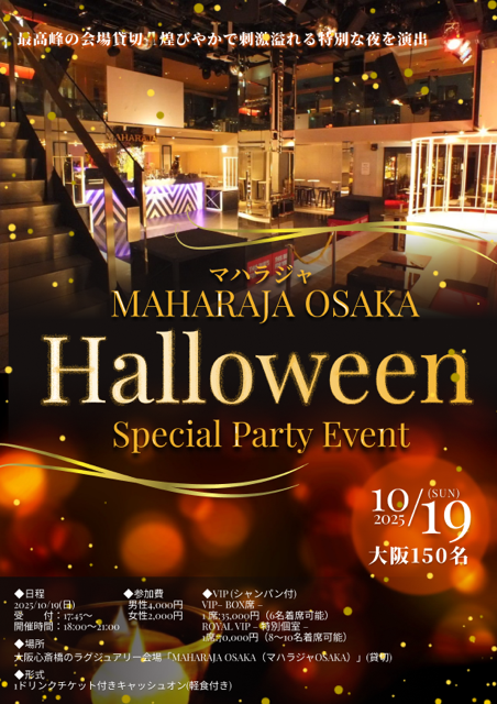 10/19(日)18:00~200名【Halloween Special Party Event】の招待状 in『MAHARAJA OSAKA(マハラジャ貸切)』 豪華会場完全貸切【煌びやかで刺激溢れる特別な夜を演出】