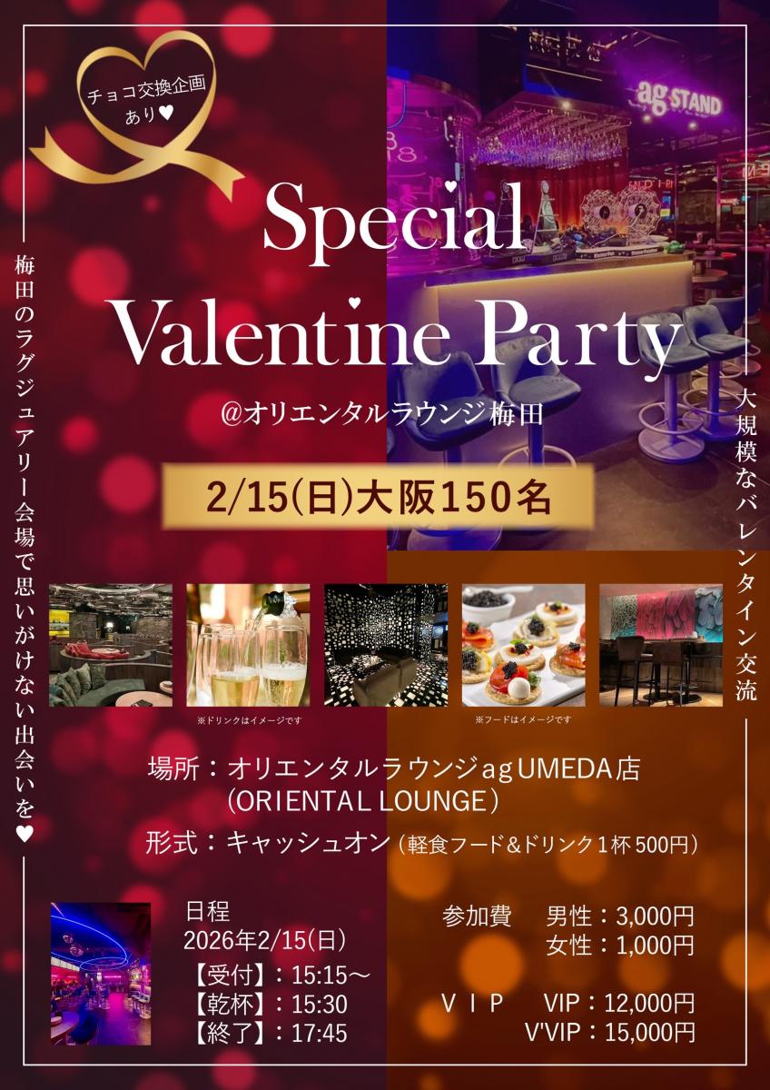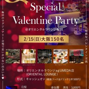 2/15(日)150名大阪/梅田Special Valentine Party【大規模交流企画】@オリエンタルラウンジ梅田の招待状【梅田のラグジュアリー会場で思いがけない出会いを!】最安値1000円キャンペーンでお得に楽しむ!DJのノリノリ選曲でテンション急上昇!出会いを加速☆彡
