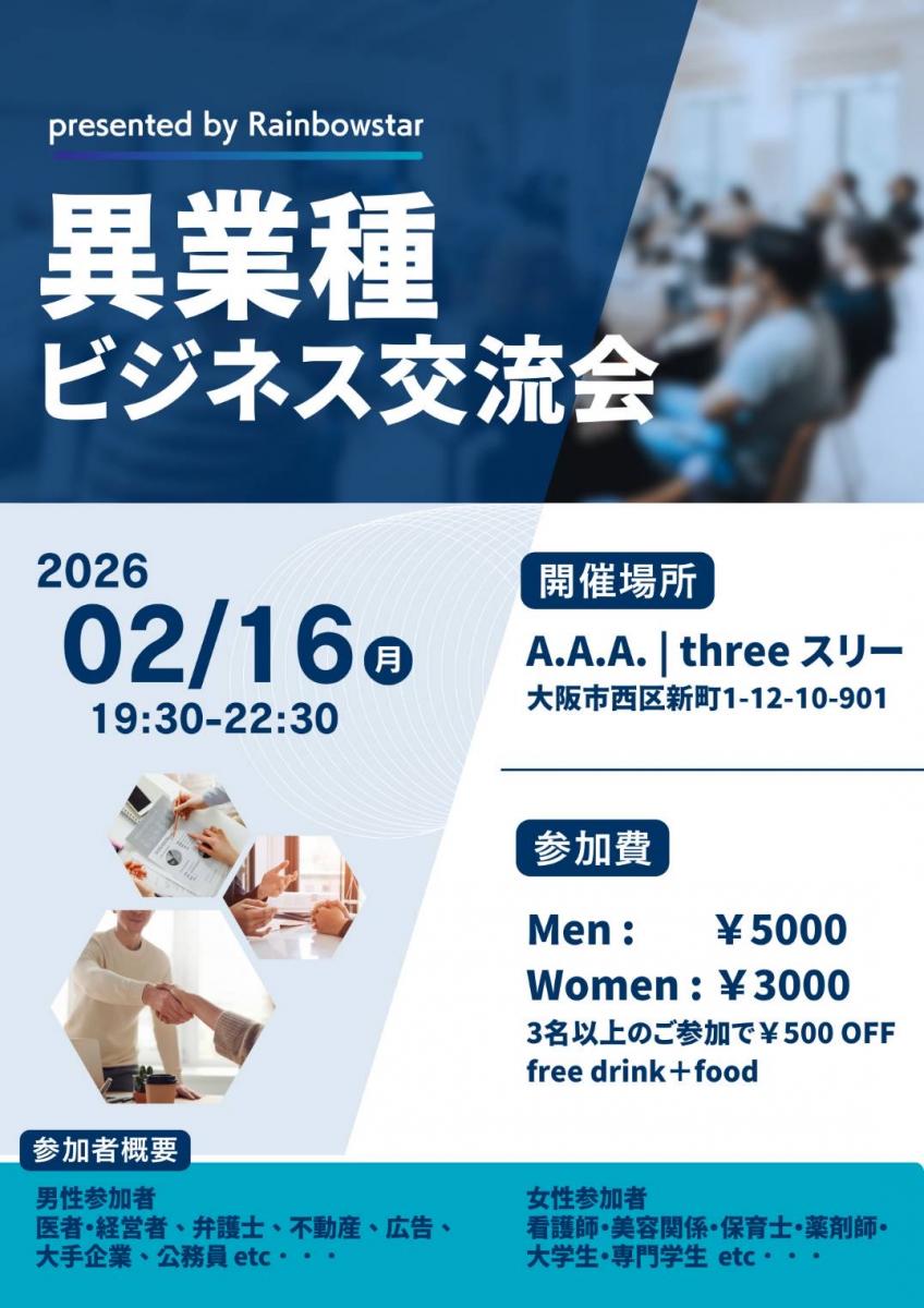 2/16(月)19:30~大阪40名ビジネス異業交流会【ビジネスパーソン向けの異業種交流会】 前回は40名満席!色んな職業の方と交流できる大好評企画♩